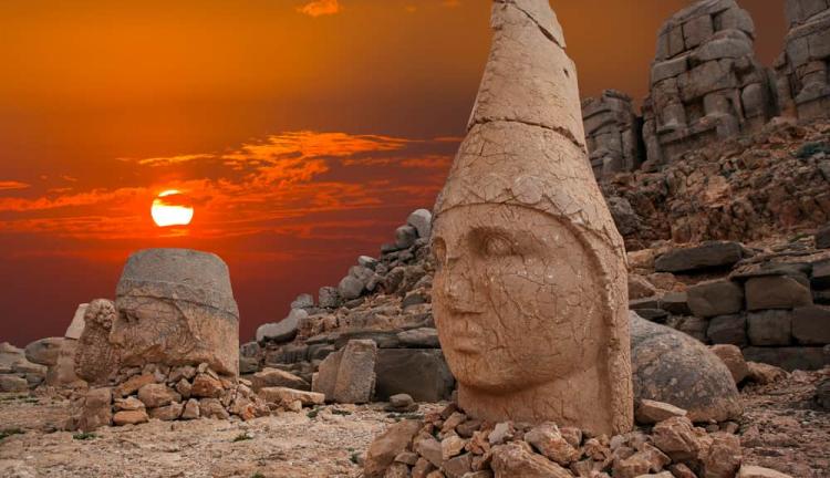 giderek daha etkileyici bir hal alır. 2150 metre yükseklikte, Kral I. Antiochos’un tanrılarla kendisini yan yana konumlandırdığı dev heykellerle karşılaşıyoruz. Doğu ve Batı teraslarında yer alan bu heykeller, Yunan ve Pers inançlarının eşsiz bir sentezidir. Rehberimizin anlatımları
